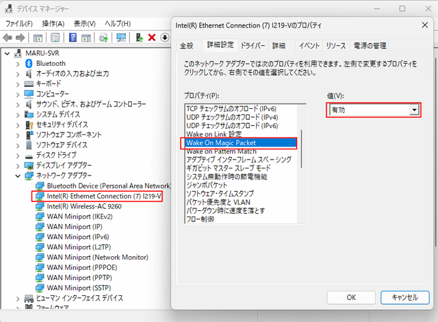 デバイスマネージャーから LAN ボードの詳細設定を開き、Wake On Magic Packet を「Enabled」に設定します。