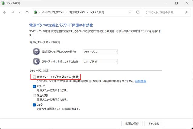 - 「高速スタートアップを有効にするに(推奨)」のチェックを外して「変更の保存」を押下します。