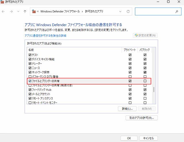- 一覧からファイルとプリンタの共有を選択してプライベートとパブリックをチェック入れます。