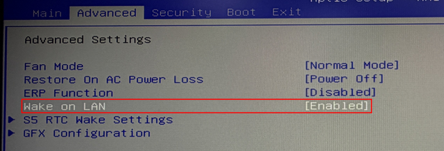 BIOS の「Advanced」または「Power」内にあるWake on LAN を「Enabled」に変更します。