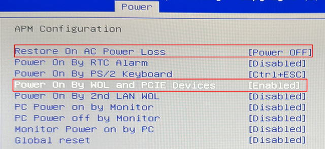 Power on By WOL and PCIE DevicesをEnabledにします。デフォルト=Disablde