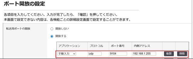 - アプリケーション:手動入力、プロトコル:udp、ポート番号:9104、内側アドレス:192.168.1.255
